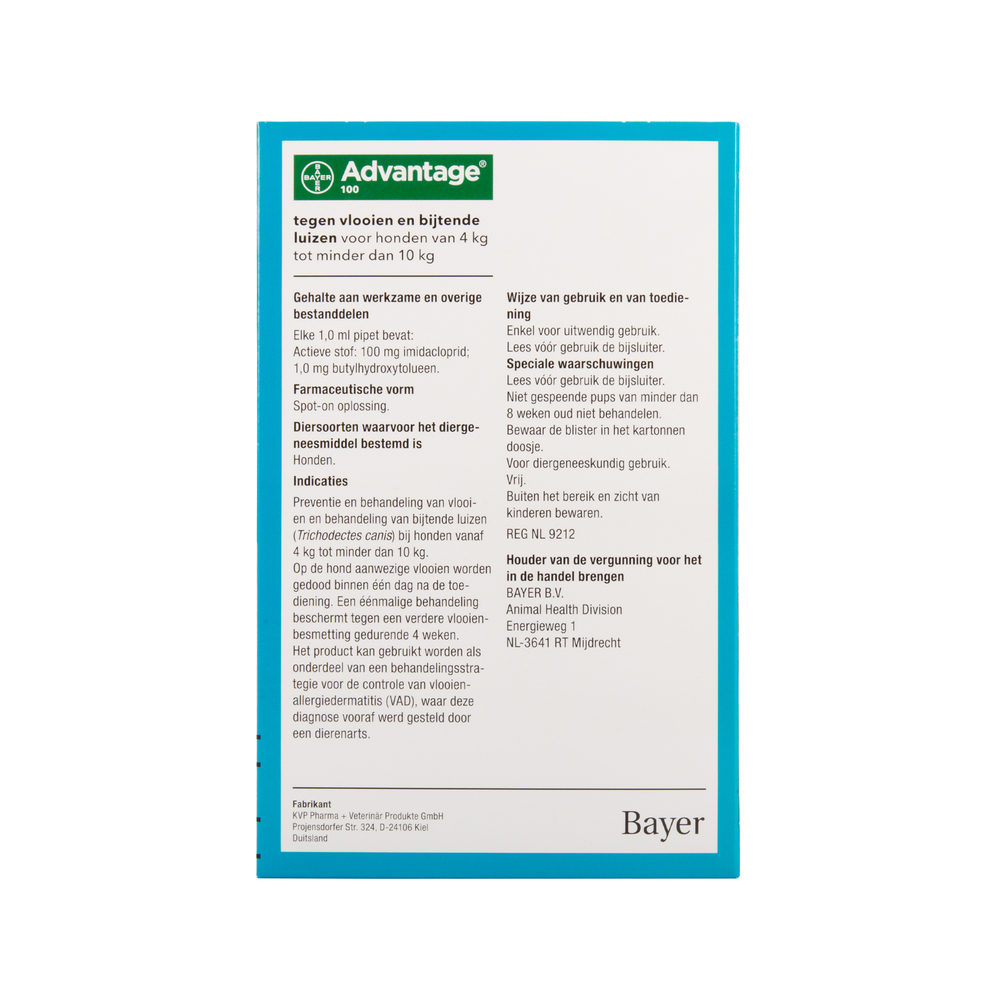 Advantage Hond mag niet gebruikt worden bij honden die overgevoelig zijn voor het werkzame bestanddeel imidacloprid en bij niet gespeende pups die jonger zijn dan acht weken. Werkzame stof Imidacloprid. 4×1 ml