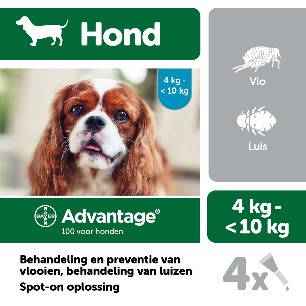 Advantage Hond met als actieve stof imidacloprid werkt preventief en curatief tegen vlooien en bijtende luizen. Het product stopt het bijten van vlooien in 3 tot 5 minuten en doodt de volwassen vlooien binnen het uur, voordat zij eitjes kunnen leggen. De vlooien die op je hond aanwezig zijn, worden allen gedood binnen 24 tot 48 uur na toediening.Daarnaast voorkomt Advantage Hond een herbesmetting. Advantage Hond kan ook worden ingezet voor de behandeling van bijtende luizen bij de hond. Een enkele behandeling met Advantage Hond beschermt je hond gedurende 4 weken tegen vlooien. Advantage Hond kan tevens worden ingezet als onderdeel van een strategie voor de behandeling van een vlooienallergie/dermatitis.Indicaties