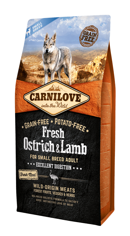 Samenstelling: vers struisvogel, ontbeend (26%), gedroogd lam (20%), gedroogde kalkoen (20%), kippenvet (geconserveerd met tocoferolen, 9%), pompoen, kikkererwten, erwten, kippenlever (3%), zalmolie (2%), appels, wortels, lijnzaad, gehydrolyseerde schaaldierschalen (een bron van glucosamine, 0,026%), kraakbeenextract (een bron van chondroïtine, 0,016%), bakkersgist (een bron van mannan-oligosachariden, 0,015%), cichoreiwortels (een bron van fructo-oligosachariden, 0,01%), Yucca schidigera (0,01%), algen (0,01%), psyllium (0,01%), tijm (0,01%), rozemarijn (0,01%), oregano (0,01%), cranberry’s (0,0008%), bosbessen (0,0008%), duindoorn (0,0008%), gemberwortel (0,0008%), salie (0,0008%).