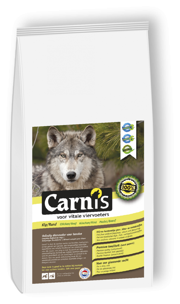 Carnis Geperste brok Kip & Rundis een volledige voeding voor honden met een normale tot hoge activiteit van alle leeftijden en rassen. De samenstelling van Kip & Rund zorgt voor een stabiele darmflora.