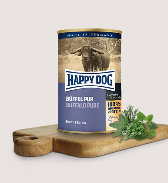 Het natvoer voor honden Happy Dog Büffel Pur wordt uitsluitend geproduceerd op basis van vers geslacht buffelvlees uit de regio en bevat geen soja, geen plantaardige ingrediënten en geen kleurstoffen en conserveringsmiddelen.